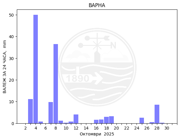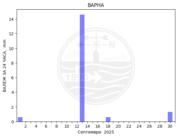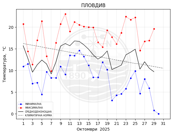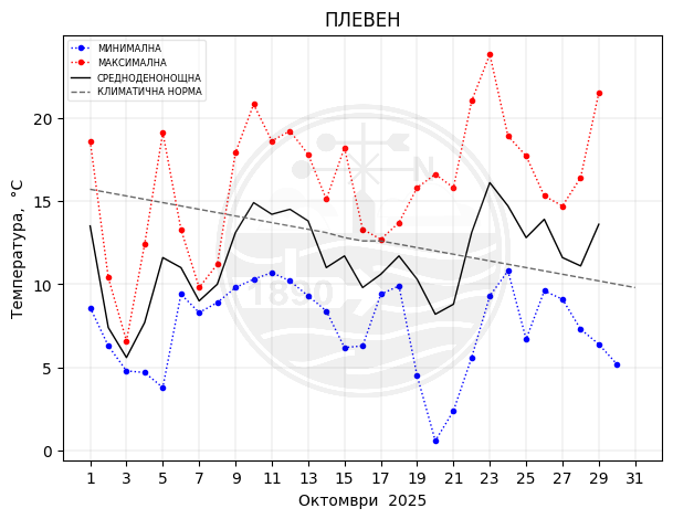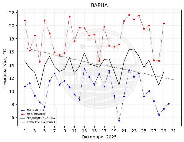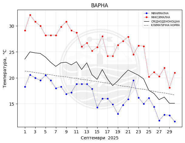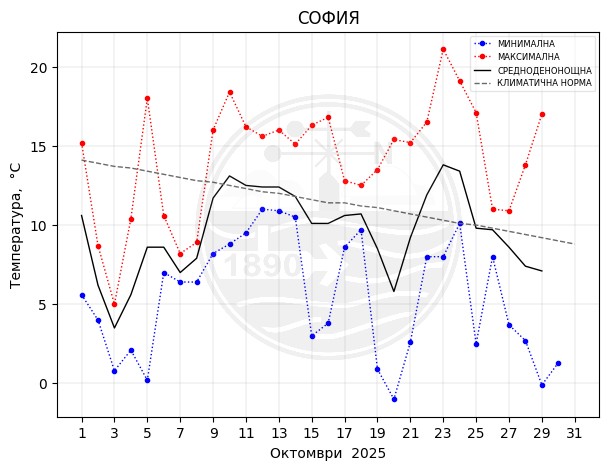 What do you see on the maps with the minimum and maximum temperatures? On the map with the minimum/maximum measured temperatures by synoptic station, you will see one value in degrees Celsius (℃) above the written name of each city that has a NIMH synoptic station. It is the minimum/maximum value recorded by the measurements in the corresponding way for that particular day. At the bottom right of the map is the date to which the corresponding temperature measurements relate.